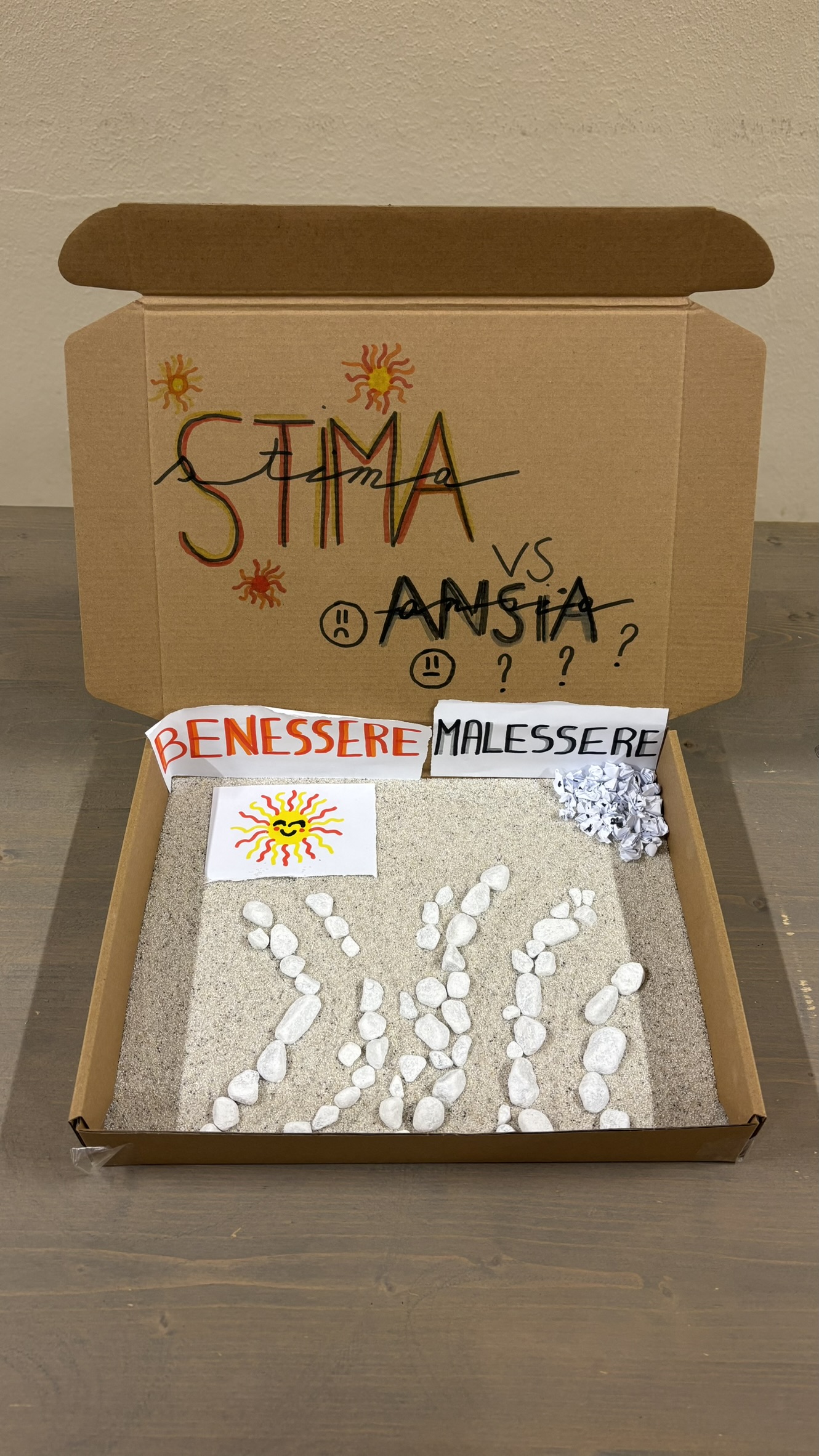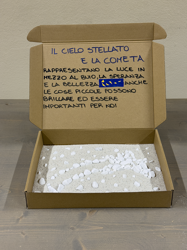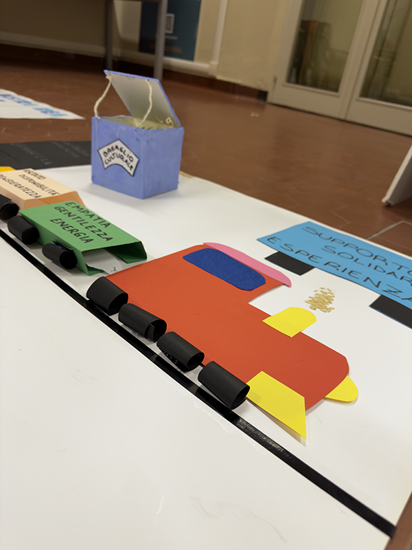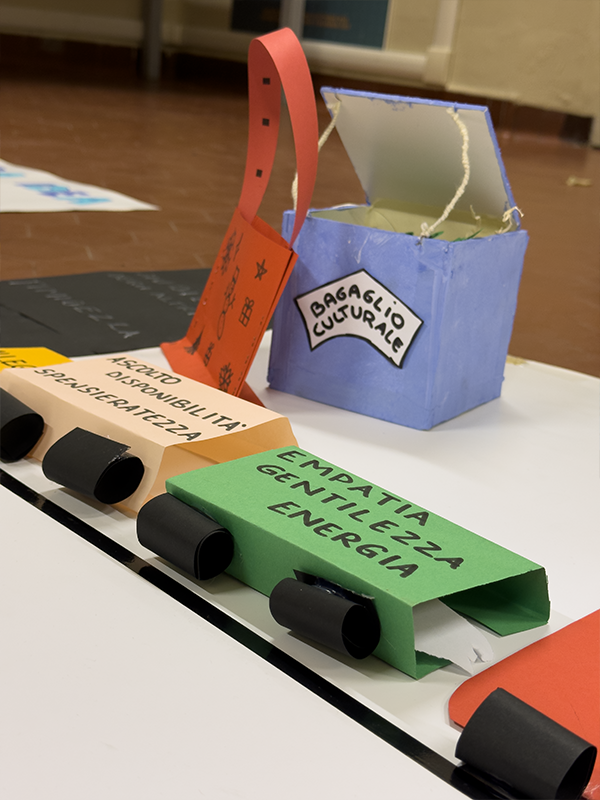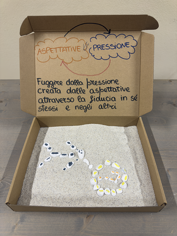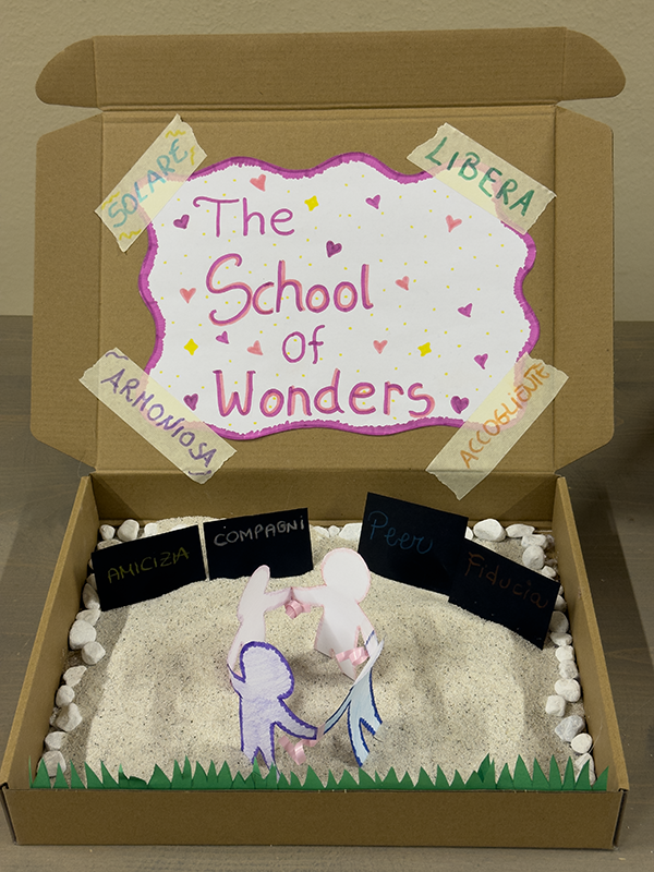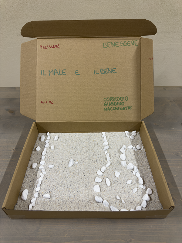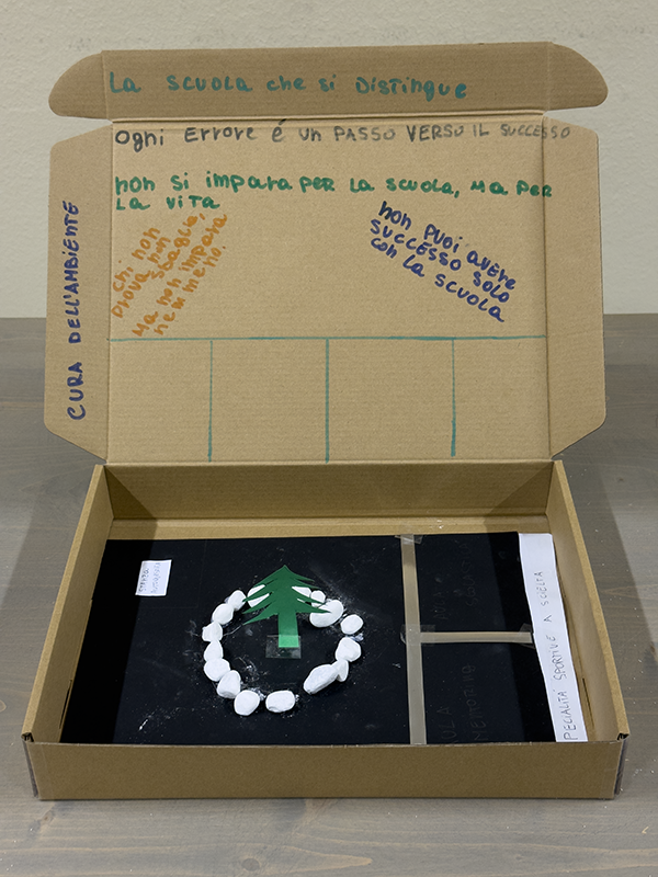 Utilizzando scatole di cartone, sassi bianchi, tempere, carta colorata, forbici e pennarelli, i ragazzi, insieme agli insegnanti, hanno costruito piccoli elaborati tridimensionali capaci di restituire il vissuto degli ambienti scolastici. Sono nate così rappresentazioni che raccontano la scuola come luogo fisico, ma anche come spazio emotivo e relazionale, in grado di incidere profondamente sul benessere di chi lo abita.